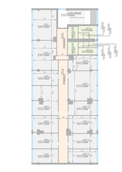 - Ilość pomieszczeń: 13 pomieszczeń biurowych