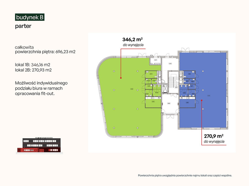 Oferta dotyczy budynku 41Z o powierzchni całkowitej 1 976 m² (powierzchnia najmu do 1788 m2), rozlokowanej na trzech kondygnacjach. Budynek wyposażony jest w windę i podzielony na moduły biurowe: