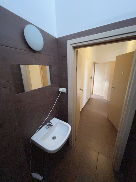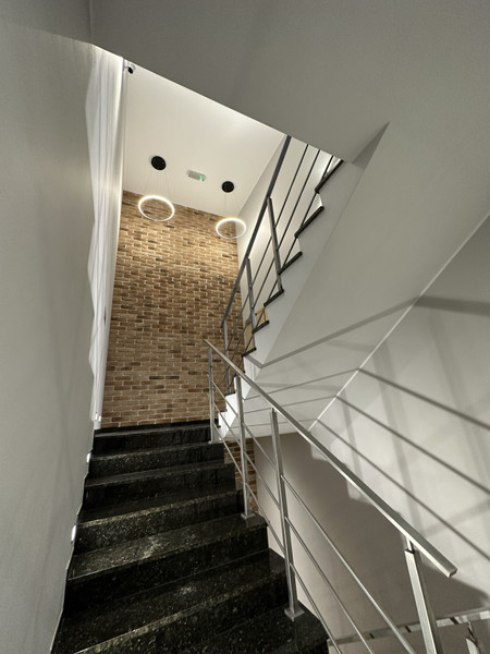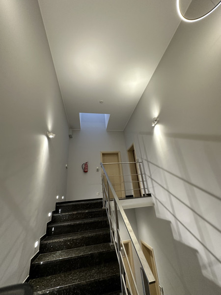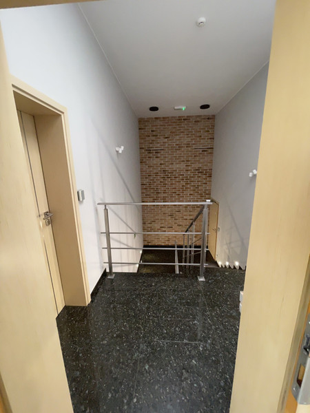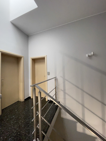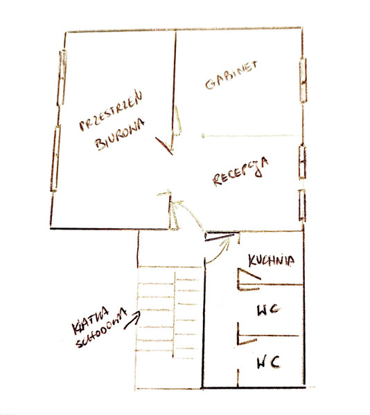 duży open-space / pokój główny, dwa dodatkowe gabinety, kuchnia, łazienka z WC, korytarz i wejście po eleganckiej klatce schodowej.