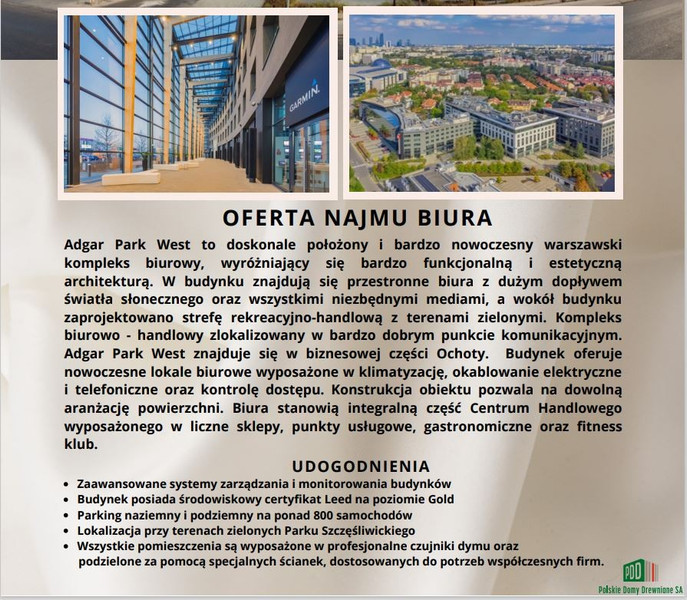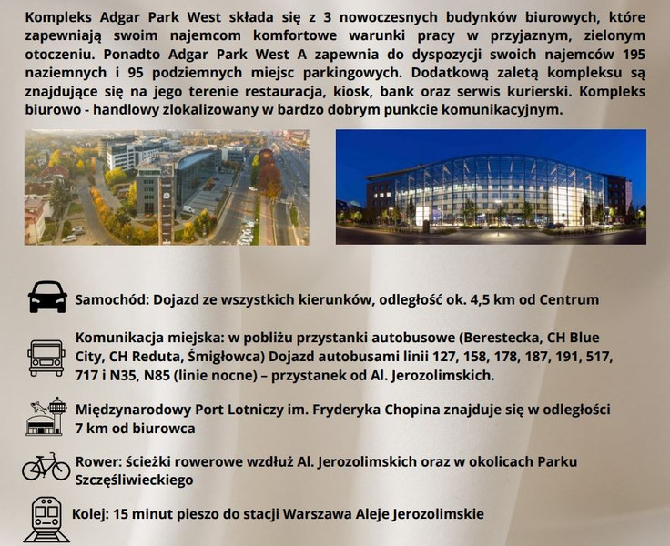• Adgar Park West to wysokiej klasy kompleks oferujący powierzchnię biurową w trzech oddzielnych budynkach;