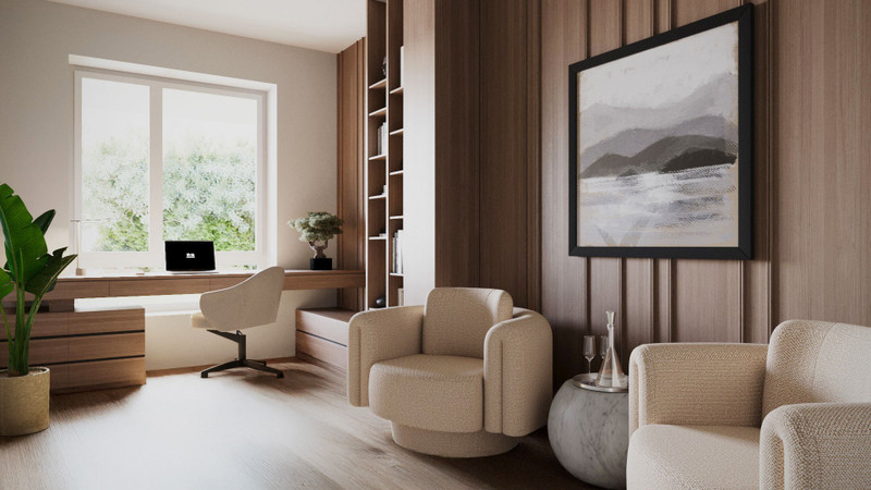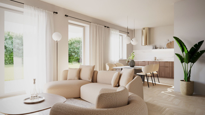 Przestronny i jasny salon z dużymi przeszkleniami, wydzielona kuchnia, 3 sypialnie, 2 łazienki, pomieszczenie gospodarcze, garaż, taras i duży ogród – idealne dla rodzin oraz osób pracujących zdalnie.