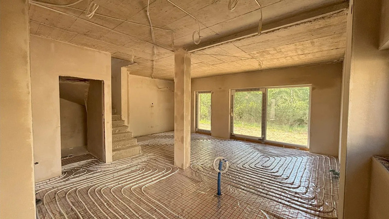 Podłoga parteru. Na płycie fundamentowej warstwa izolacji akustycznej i termicznej ze styropianu EPS z prowadzeniem instalacji, na niej jastrych cementowy bez warstwy wykończeniowej.