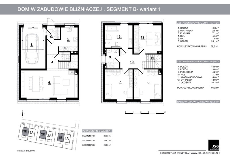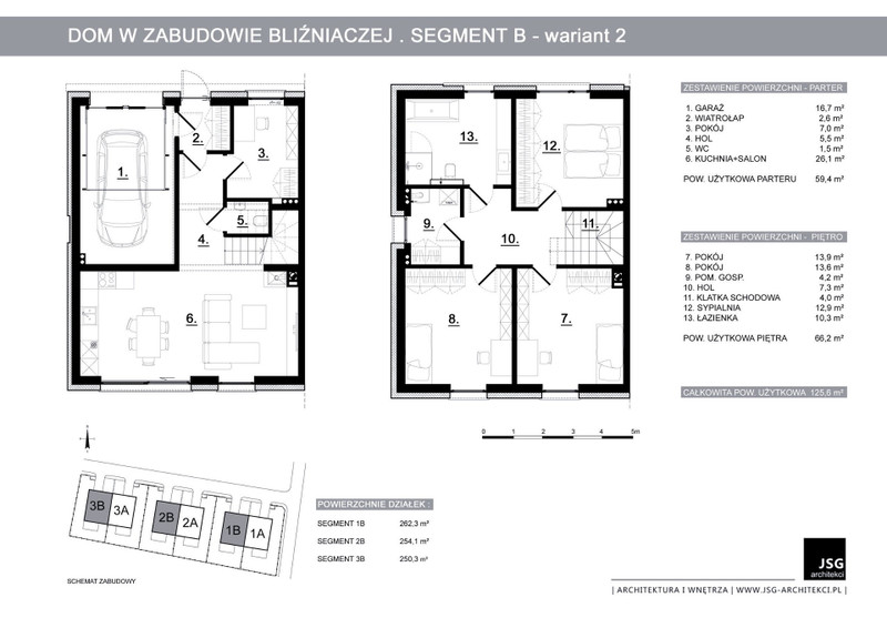 Budynek niepodpiwniczony, dwukondygnacyjny z dachem płaskim, garażem w bryle budynku i przydomowym ogrodem. Budynek zaprojektowany jest funkcjonalnie dla potrzeb czteroosobowej rodziny. Na parterze znajduje się część dzienna – salon (26,1 m2), kuchnia (7,1 m2), toaleta (1,5 m2), wiatrołap (2,6 m2), hol (5,5 m2) oraz garaż (16,7 m2), natomiast na piętrze część nocna – trzy (3) sypialnie domowników (13,9 , 13,6 i 12,9 m2), łazienka (10,3 m2) oraz pralnia z kotłownią (4,2 m2) , które są dostępne bezpośrednio z holu (7,3 m2).