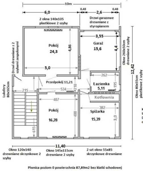 1 poziom - przyziemie, wysokość 2,2m. Powierzchnia 88mkw. Duży pokój z aneksem kuchennym, może służyć jako kuchnia letnia. Mały pokój, sypialnia. Łazienka z prysznicem, bidetem, umywalka i ubikacją. Garaż jednostanowiskowy. Pomieszczenie gospodarcze przeznaczone na składowanie różnych rzeczy. W pomieszczeniu gospodarczym znajduje się piec gazowy do ogrzewania poziomu. Pod schodami znajduje się piwniczka.