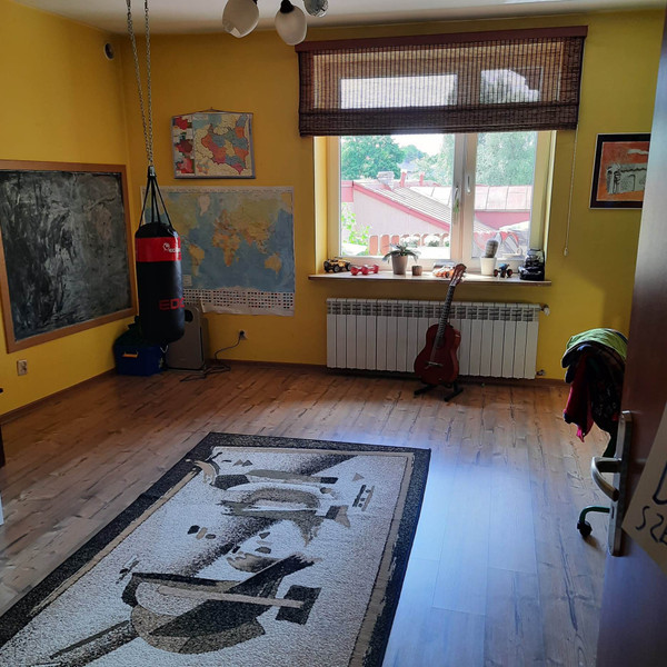 4 pokoje, kuchnia, dwie łazienki. W podpiwniczeniu piwnica, kotłownia, łazienka, toaleta, dwa pomieszczenia do zamieszkania. Możliwość prowadzenia działalności gospodarczej w budynku od strony parku (kawiarenki, sklepu, usług). Brama wjazdowa automatyczna, domofon, na podwórku kostka granitowa.. Możliwość podłączenia gazu z sieci - odległość 1 metr od budynku.