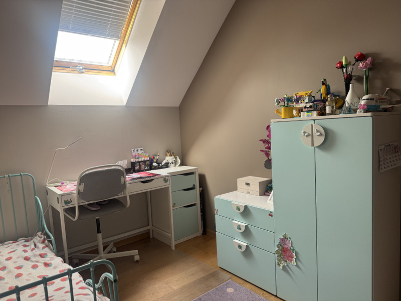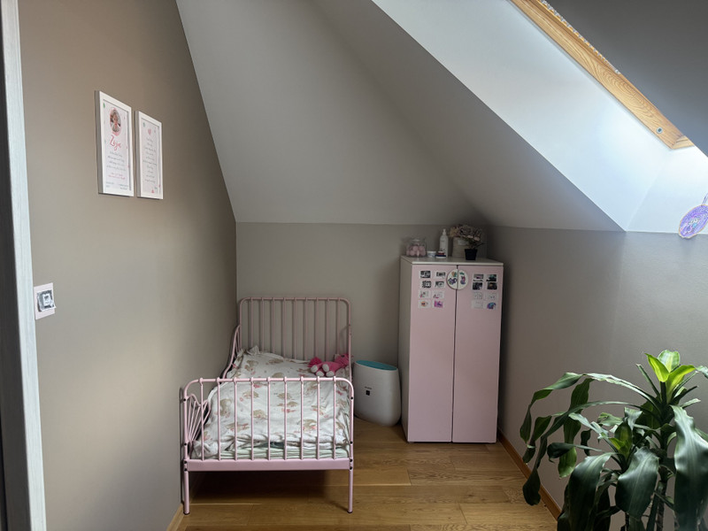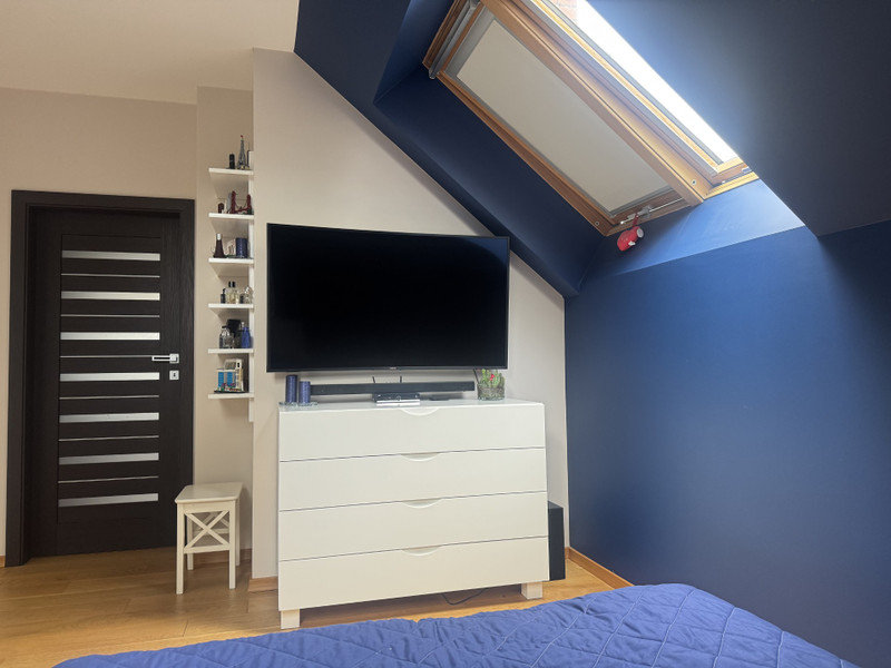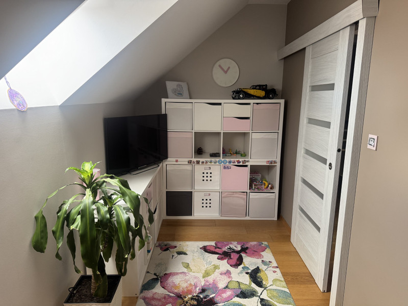 Piętro to duża sypialnia, łazienka z oknem i wanną, oraz dwa pokoje dziecinne - przechodnie.