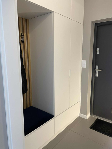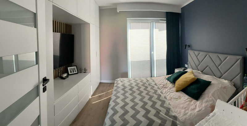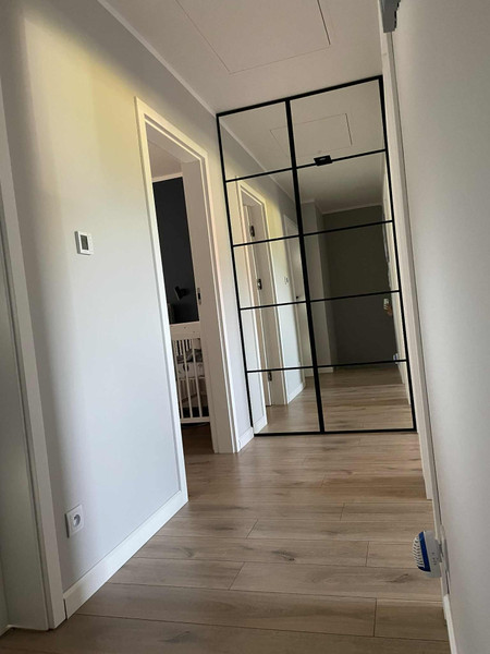 Na piętrze znajdują się dwa pokoje o powierzchni 9m2, sypialnia z zabudową meblowa i RTV, korytarz z garderobą(wejście do garderoby zasłonięte jest loftowymi drzwiami z lustrem) oraz łazienka z wanną(dodatkowo w pomieszczeniu znajduję się szafa z miejscem na pralkę, suszarkę oraz kosz na pranie)