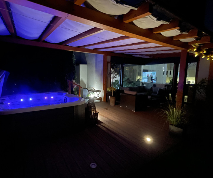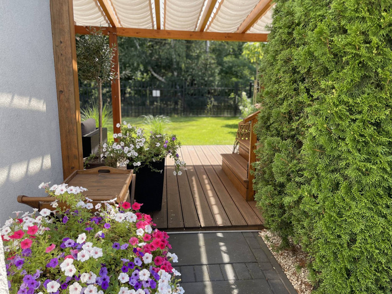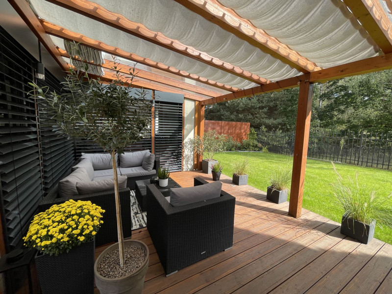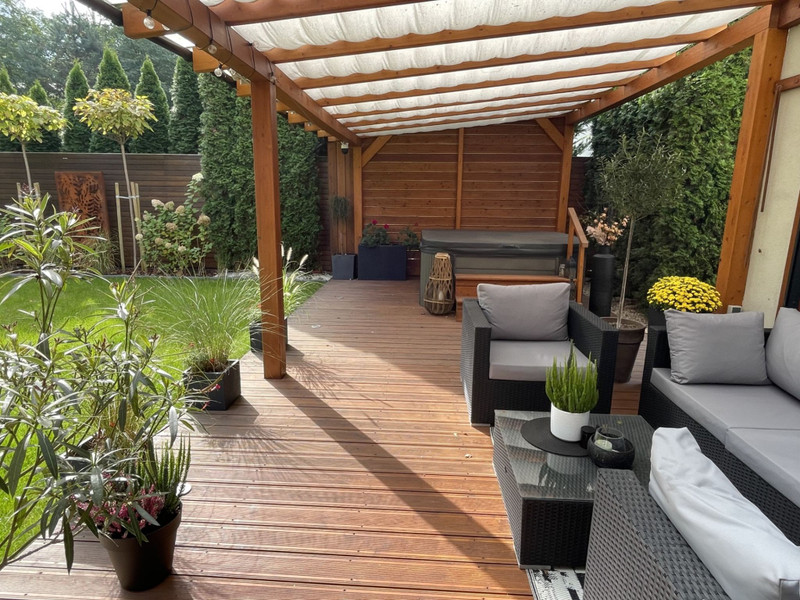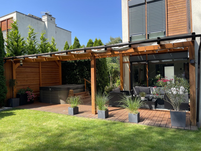 Nieruchomość dodatkowo posiada 23 m taras zadaszony piękną szklaną pergolą, pod którą znajdziesz 4 osobowe jacuzzi oraz miejsce do wypoczynku z niesamowitym widokiem na las.