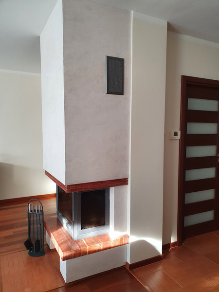 Salon połączony z kuchnią, wyjście na ogród oraz zadaszony taras (kominek na drewno opałowe).