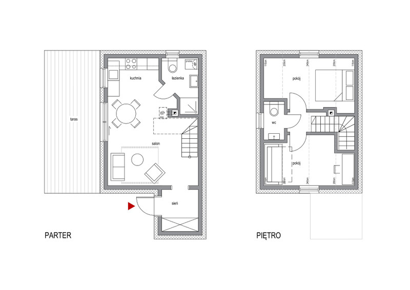 parter: przedsionek, salon z jadalną i aneksem kuchennym, łazienka, schody na piętro