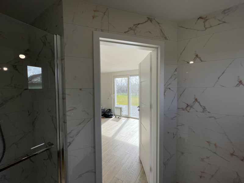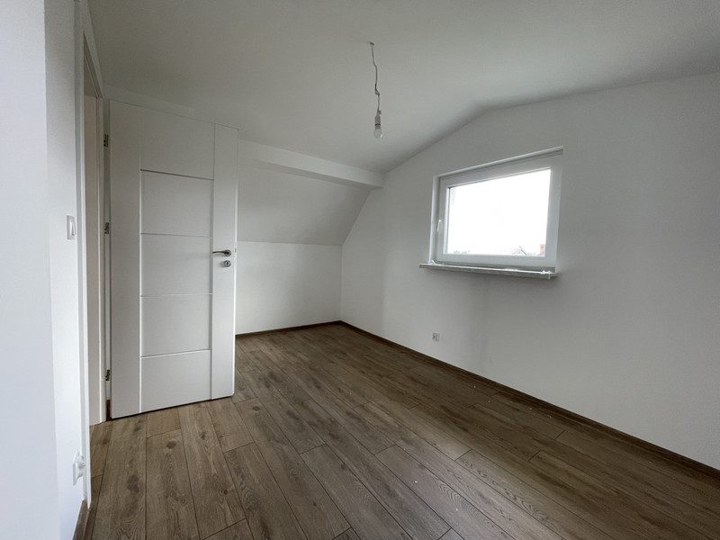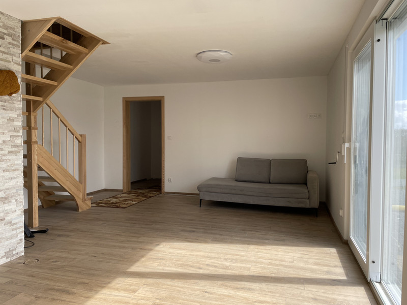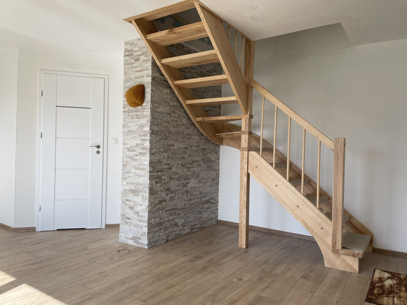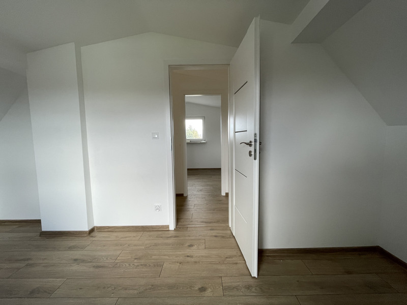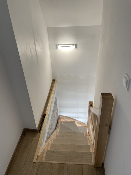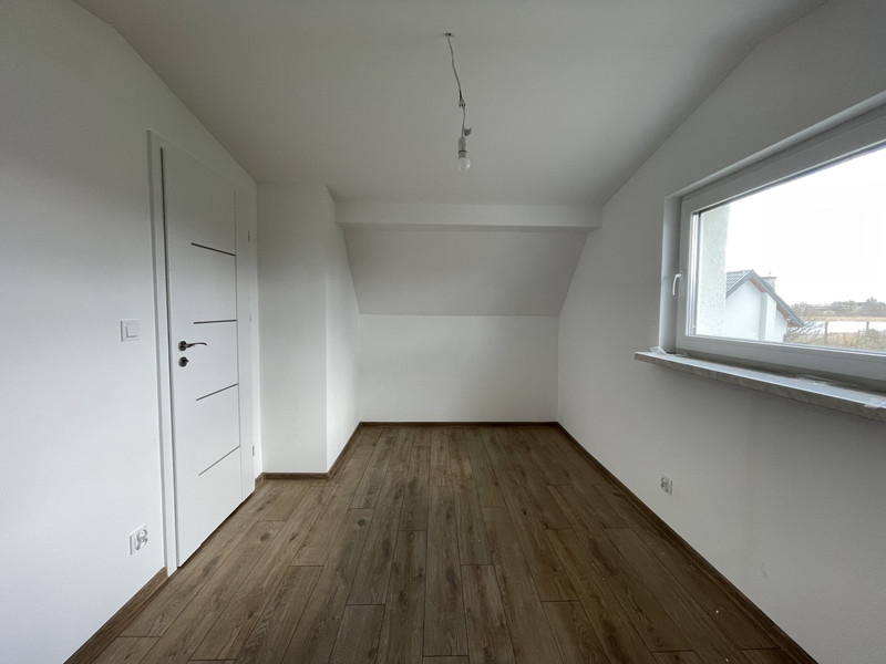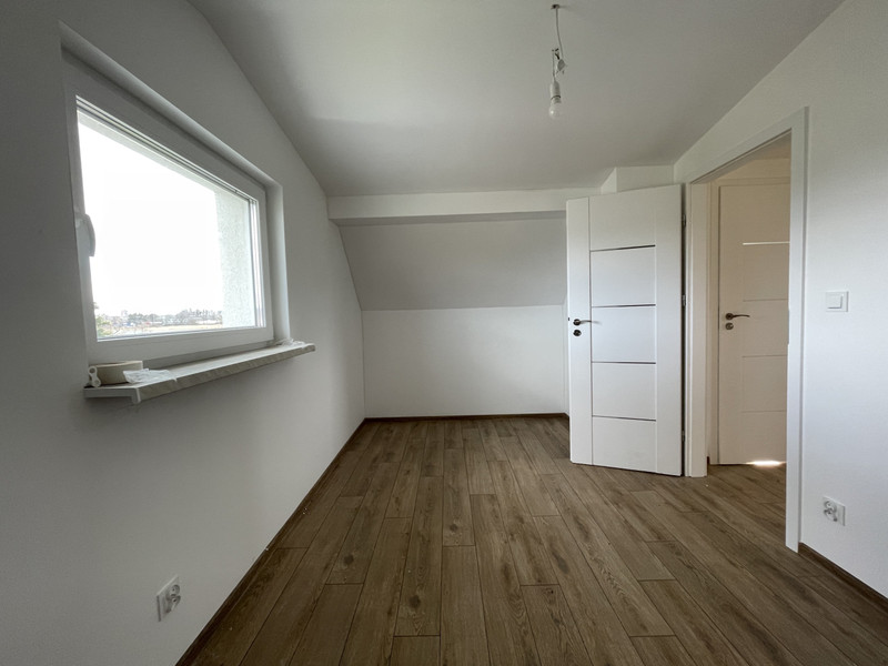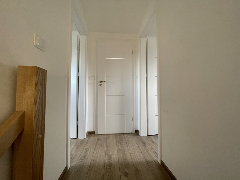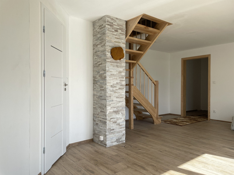 Drzwi w kolorze białym do pokoi i sanitariatów; Schody dębowe prowadzące na piętro; pokoje częściowo umeblowane,