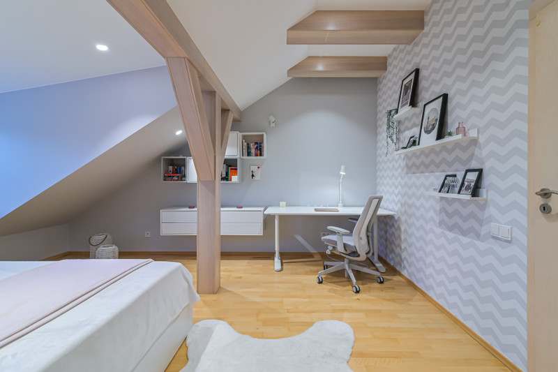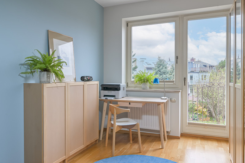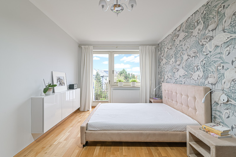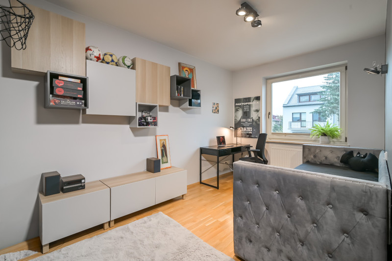 Dwie pary podwójnych drzwi balkonowych prowadzą na częściowo zadaszony taras (13,5m2) i do ogrodu.