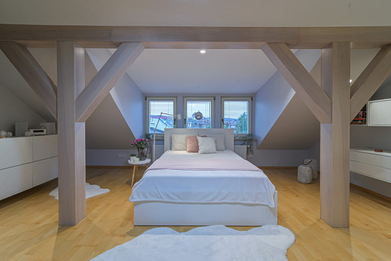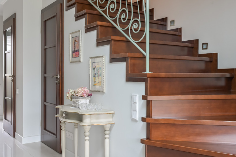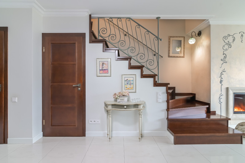 Drzwi oraz schody wewnętrzne także wykonane na zamówienie z litego drewna.