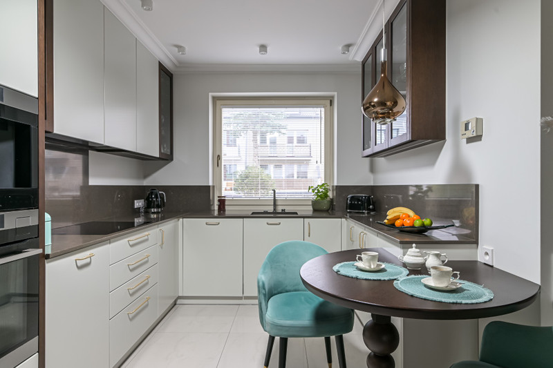 W kuchni także drewniany blat śniadaniowy z dwoma tapicerowanymi krzesłami (w cenie).
