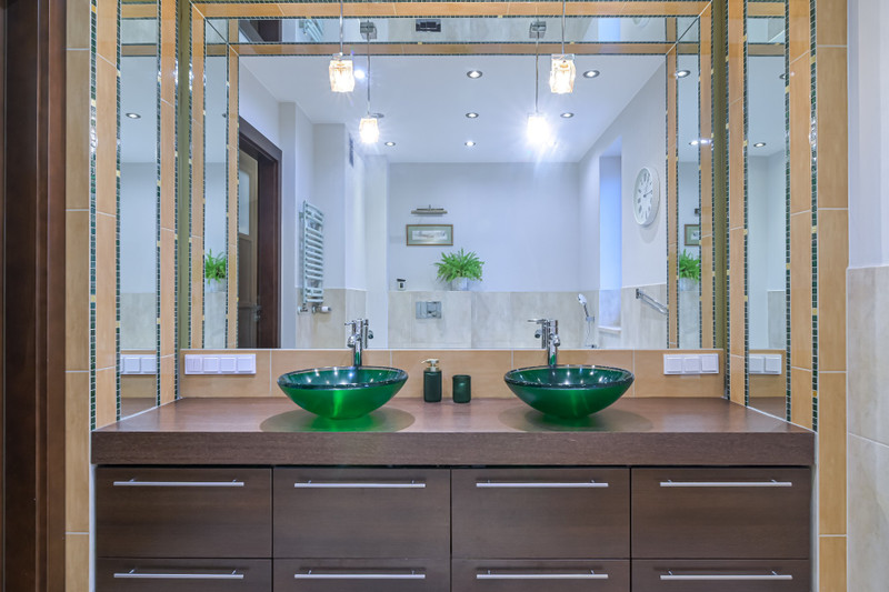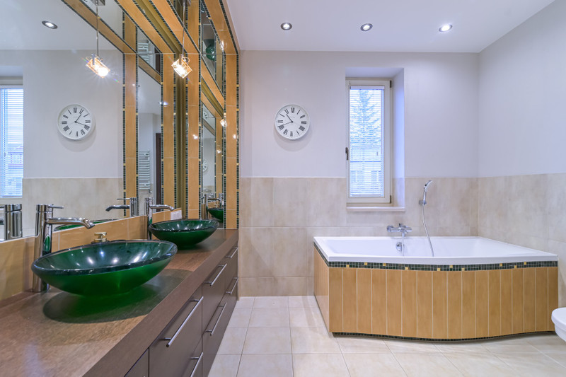 Duża, stylowa rodzinna łazienka z dwoma szklanymi zlewami oraz wanną i toaletą.
