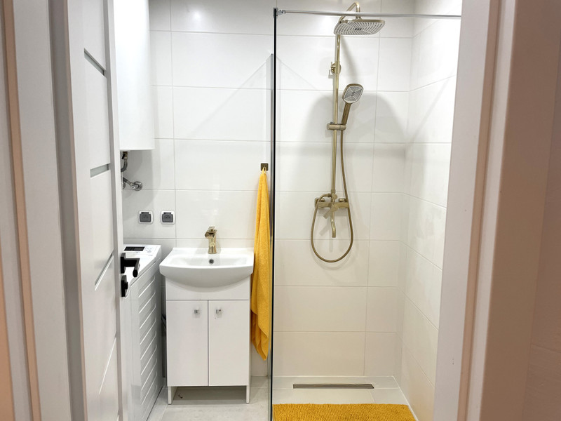 • łazienka – 4 m² (kabina walk-in z deszczownicą, WC, umywalka, pralka)