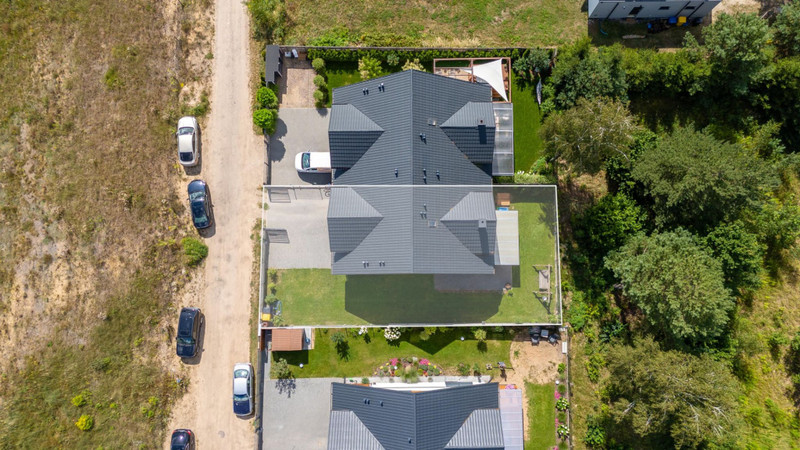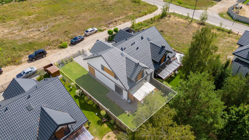 Na działce wykonano instalację nawodnienia sterowaną poprzez aplikację z telefonu, liczne nasadzenia i krzewy, ładnie zadaszony taras, podjazd podejścia i opaska wokół domu wyłożona polbrukiem. Brama wjazdowa na pilot, wideodomofon.