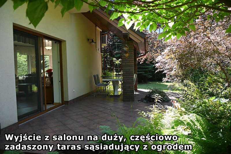 Ogromnym atutem nieruchomości jest pięknie zagospodarowany, przestronny ogród o powierzchni ok. 1000 m2. Pełen zieleni, drzew, krzewów oraz kwiatów. Zapewnia pełną prywatność. Jest zamontowany system nawadniania i koszenia trawy. Ogród został profesjonalnie zaprojektowany, z miejscem do wypoczynku, spotkań rodzinnych i grilla. Jest także idealnym miejscem do zabawy dla dzieci.