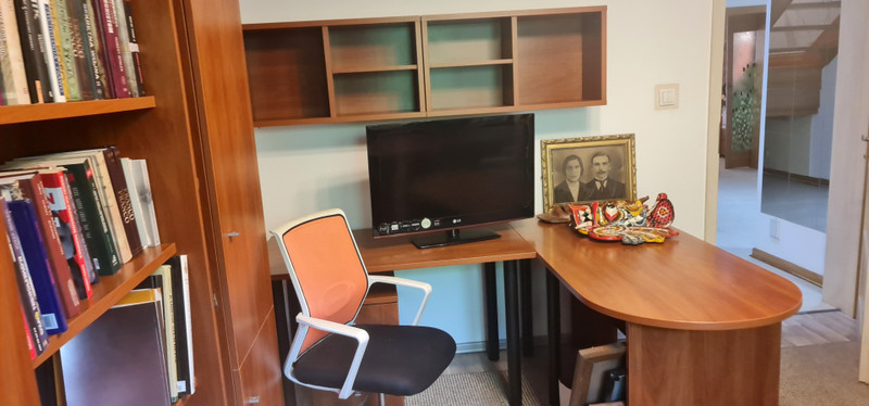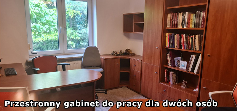 Gabinet – z wejściem z głównego holu z oknem i widokiem na ogród. Z dwoma biurkami. Zabudowany regałami idealny do pracy w domu, lub jako miejsce na osobistą bibliotekę.