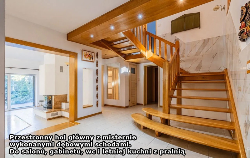 Z wejściem z obszernego holu po dębowych szerokich schodach. Niezwykłej urody i wykonania z pietyzmem.