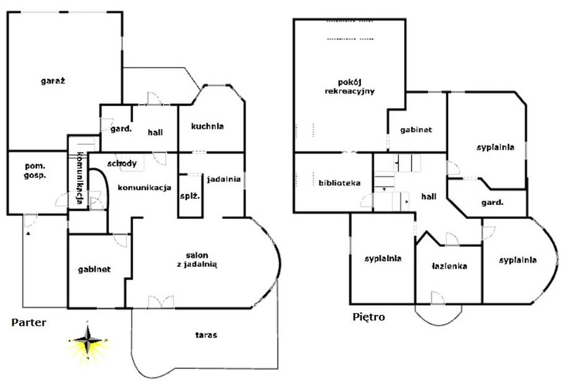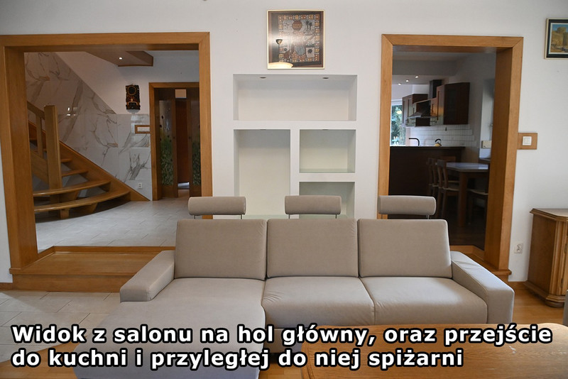 Na całym parterze widać dużą architektoniczną kulturę. Nawet komunikacja i drzwi do gabinetu, WC, drugiej kuchni, oraz do podziemia są dyskretnie rozmieszczone i nie burzą doskonałego efektu holu ze schodami na piętro.