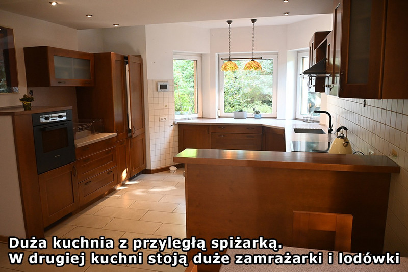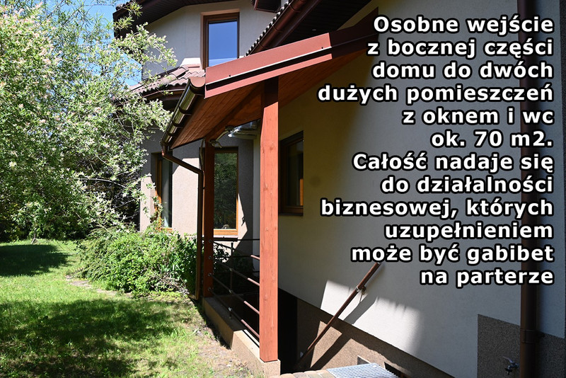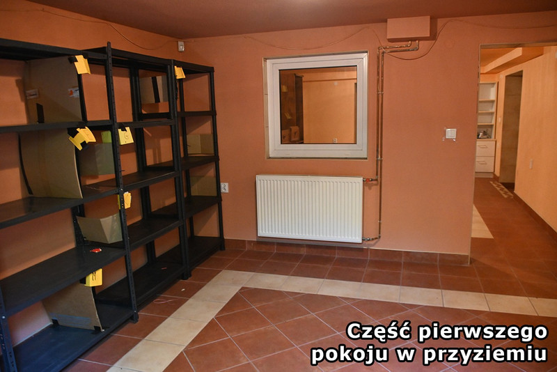 Z wejściem przy drugiej kuchni schodami w dół. Do kotłowni z zainstalowanym nowym piecem gazowym z automatyczną regulacją ogrzewania całego domu. Gwarantująca optymalną temperaturę przez cały rok. Jest też WC. Z przejściem do dwóch dużych pokoi ok. 70 m2 z oknem, w którym planowane było studio nagrań. Dlatego dobudowane zostało drugie osobne wejście po schodach z bocznej strony domu.