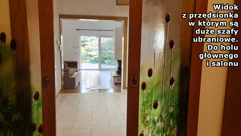 Wiatrołap z wejściem do głównego dużego holu o wysokości 5 m. Przez efektowne rozsuwane drzwi z witrażami. W wiatrołapie są trzy duże zabudowane szafy, w tym jedna okazała na długie okrycia, a druga z przeznaczeniem na buty oraz drzwi z wejściem z garażu do domu.