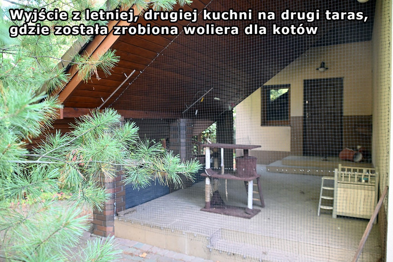 Drugi zadaszony taras ok. 20 m2 z wyjściem z drugiej kuchni. Aktualnie z założoną siatką jako woliera dla kotów. Po zdjęciu siatki może służyć do wypoczynku lub przygotowywania dań.