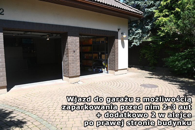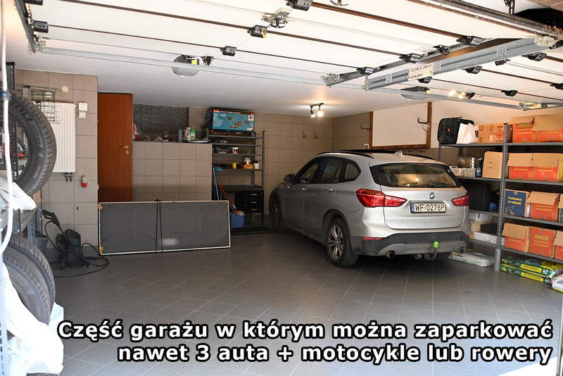Obszerny garaż, który z łatwością pomieści nawet trzy samochody, motocykle i rowery. Dodatkowo jest możliwość parkowania 2-3 samochodów na terenie posesji.