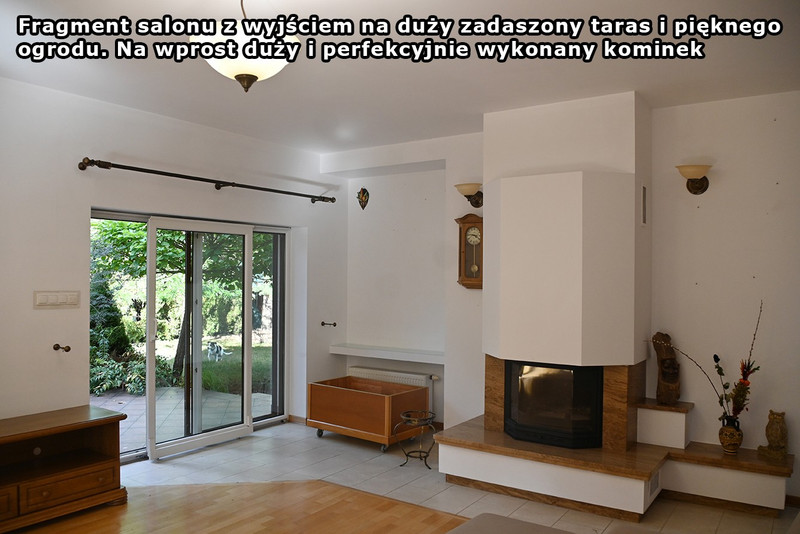 Salon 45 m2 z dębowym parkietem i klimatyzacją. Z przyległą jadalnią z panoramicznymi oknami, które otwierają przestrzeń na naturalne światło, tworząc atmosferę jasności i przytulności. Z eleganckim kominkiem. Idealnym na chłodne wieczory i spotkania w gronie rodzinnym. Z salonu wyjdziemy na zadaszony taras ok. 30 m2. Na grilla, do wypicia porannej kawy, czy wieczornej duuużej lampki wina. Jest też miejsce na rekreacyjne meble lub sprzęt.