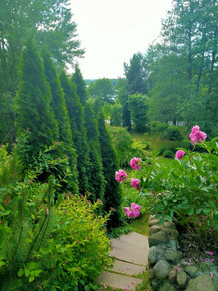 Dom jest usytuowany na skarpie z rozległym widokiem na jezioro i okolicę. Obok domu jest patio, a poniżej urozmaicony teren ze strumykiem.