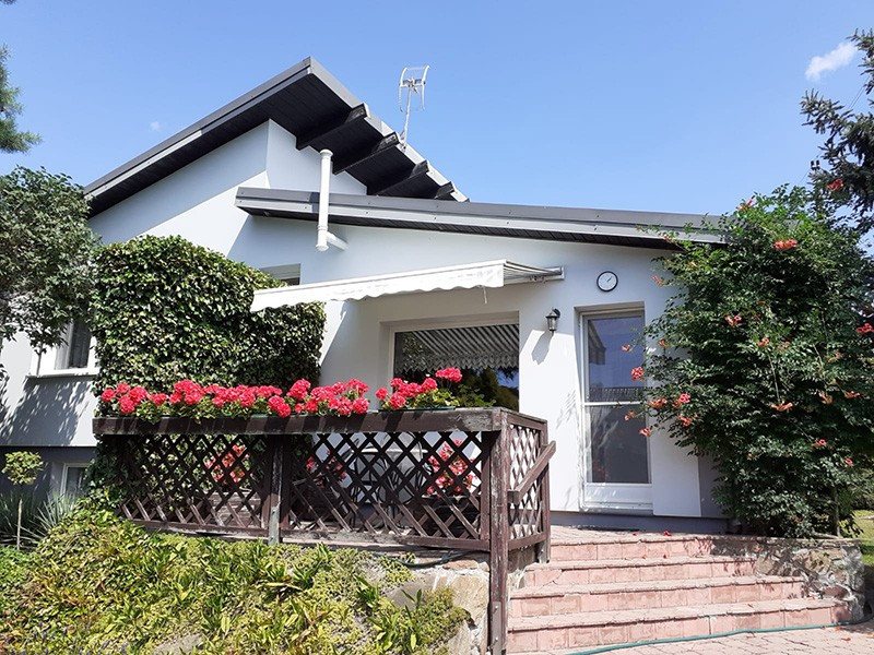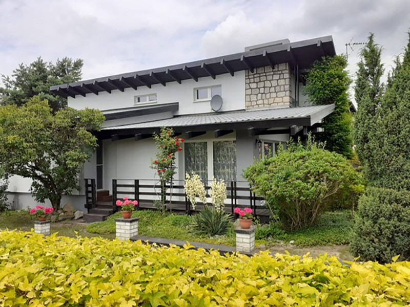 Ściany ocieplone styropianem, otynkowane i pomalowane, dach kryty blachodachówką, stolarka