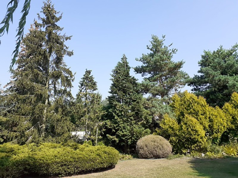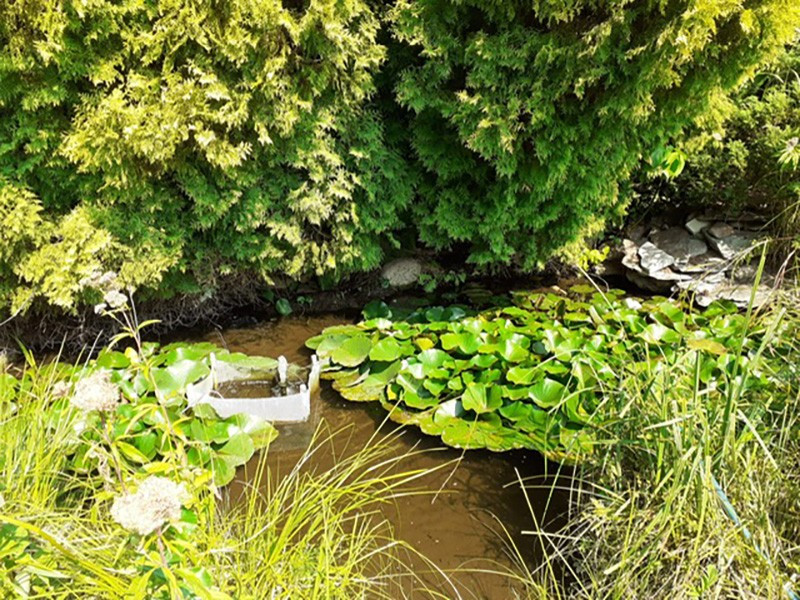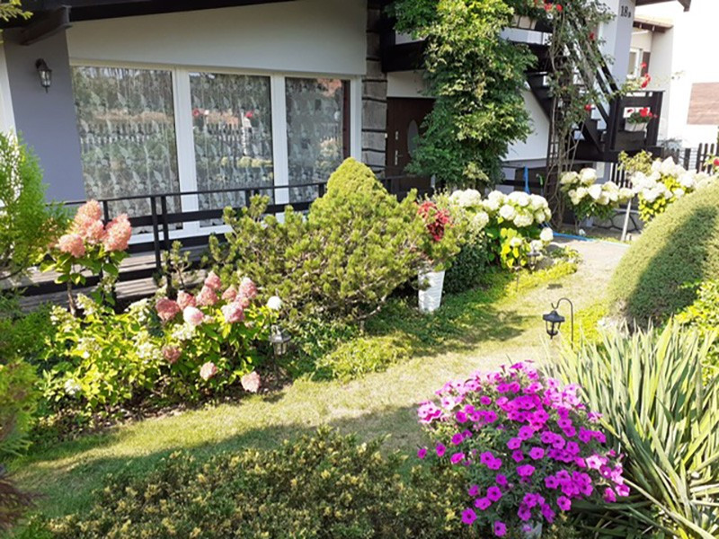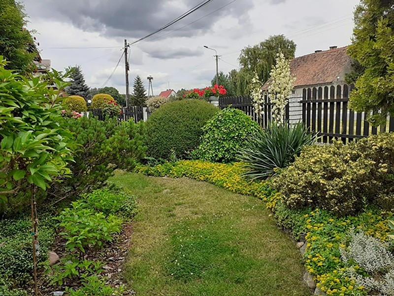 Na działce znajduje się dużo krzewów, drzewek owocowych, całorocznych kwiatów oraz małe oczko