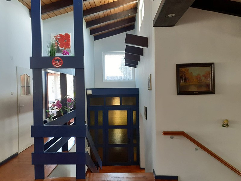 okienna PCV, drzwi wejściowe antywłamaniowe - przeszklone, schody obłożone drewnem.