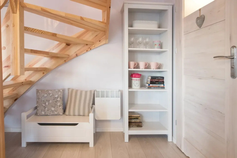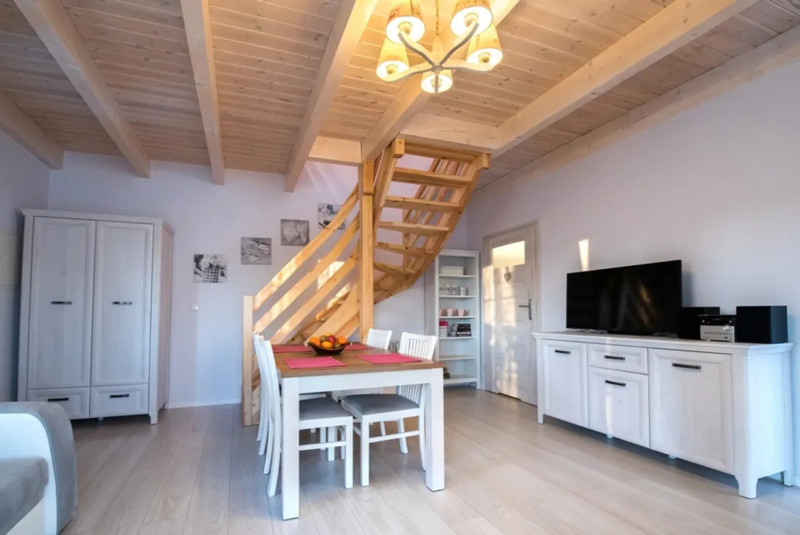 - Parter: Przytulny salon z aneksem kuchennym, kompletnie wyposażonym, kominek dla nastrojowych wieczorów oraz stół do wspólnych posiłków.