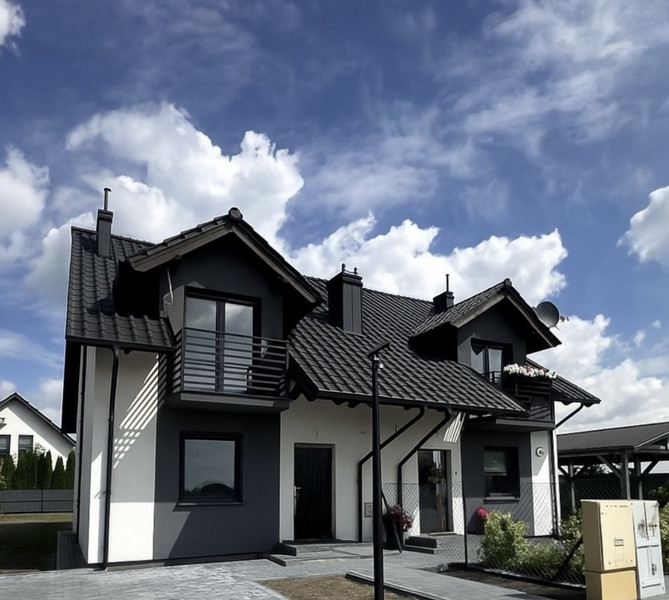 • Dach – więźba drewniana, dachówka betonowa Braas, podbitka drewniana