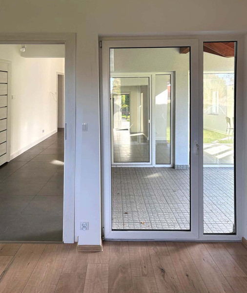 Dom jest nowy, wykończony, niezamieszkały – gotowy do własnej aranżacji. Dzięki dużym przeszkleniom i otwartemu układowi pomieszczeń, we wnętrzach dominuje światło, przestrzeń i spokój.