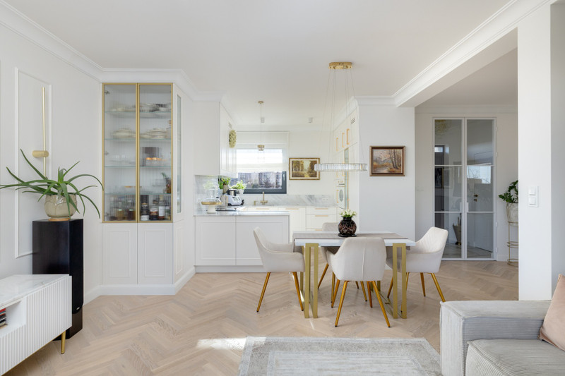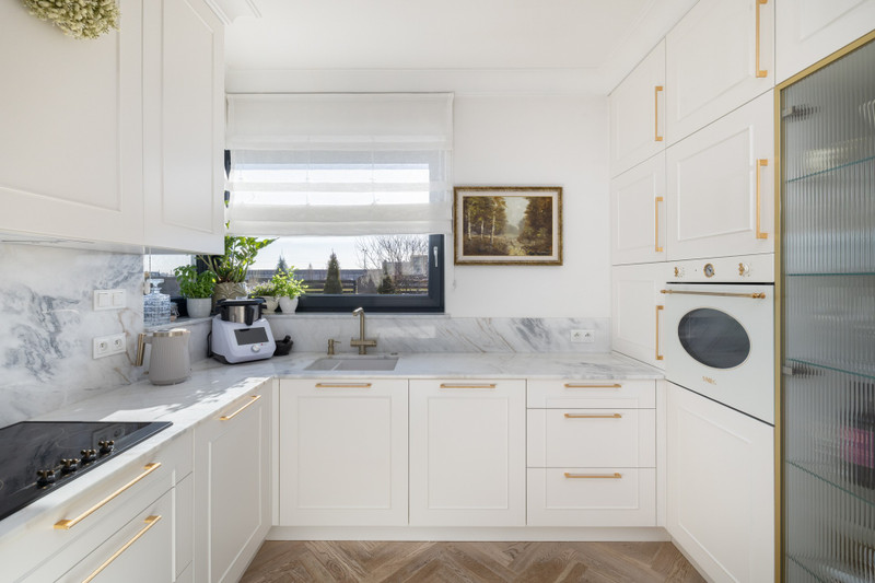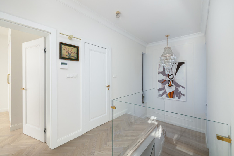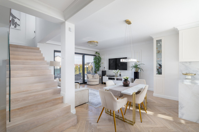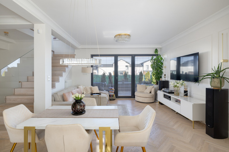 Podłoga w całym domu to jodełka klasyczna (jasna ) dębowa wraz ze schodami z tego samego materiału, balustrada szklana, kuchnia wraz z całą stolarką wewnętrzną wykonana na zamówienie. W kuchni płyta i piekarnik firmy SMEG. W sypialni zainstalowany ekran wysuwany z sufitu. W garażu siła a na podłodze żywica epoksydowa oraz zainstalowane regały podwieszane. Wygodna spiżarnia z pralnią. Wszystko utrzymane w eleganckich, neutralnych barwach. Podłogowe ogrzewanie w łazienkach i wiatrołapie oraz częściowo w salonie.