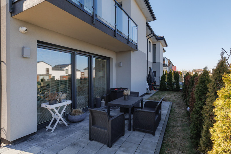 Taras wyłożony estetycznymi płytkami co daje idealne miejsce na relaks po dniu pełnym wyzwań. To tutaj z łatwością zorganizujesz rodzinne spotkania, wspólne posiłki i wieczory przy grillu, ciesząc się komfortem i pięknem otaczającej przestrzeni.