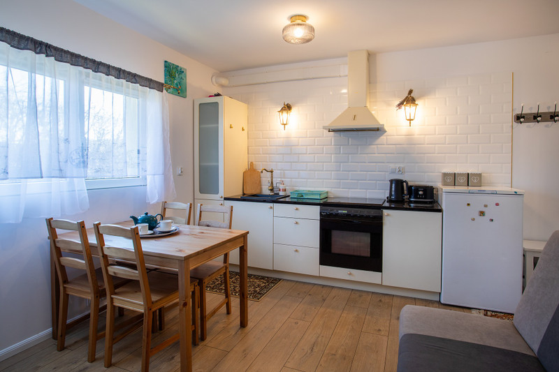 ​Przytulny pokój z obszernym aneksem kuchennym (blaty z czarnego granitu, elektryczna kuchenka z