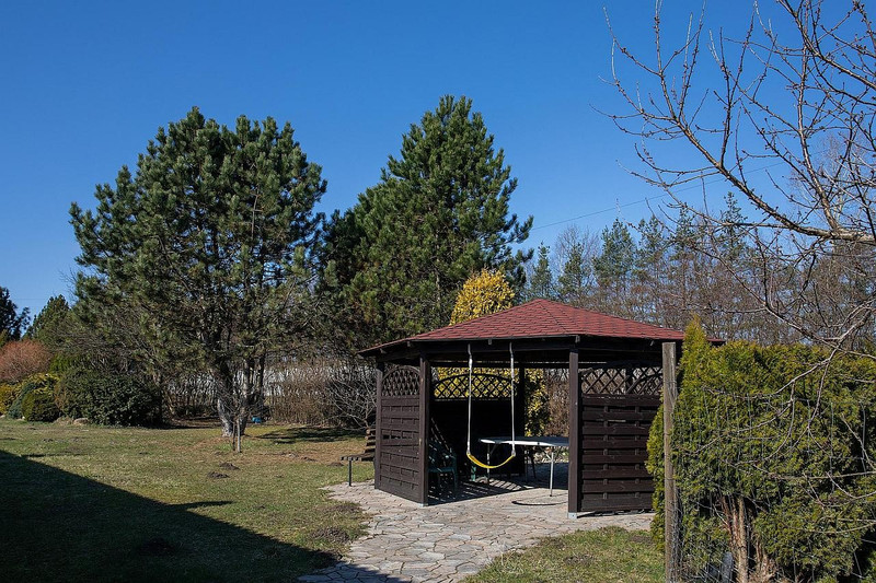 5. Solidna ośmiokątna drewniana altana, z kamienną posadzką oraz wyodrębnionym miejscem na grilla. Dostęp utwardzoną ścieżką.