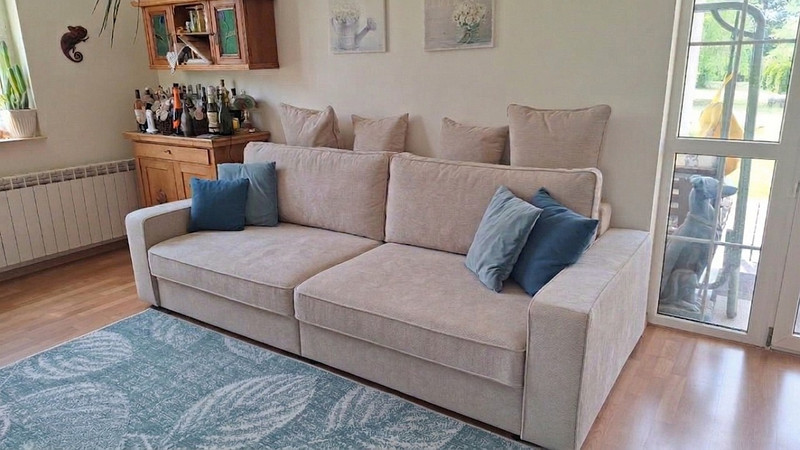 piekarnikiem, okap, lodówka, antracytowy kompaktowy zlewozmywak z kompozytu), drewniany stół dla 4 osób oraz 2 kanapy.