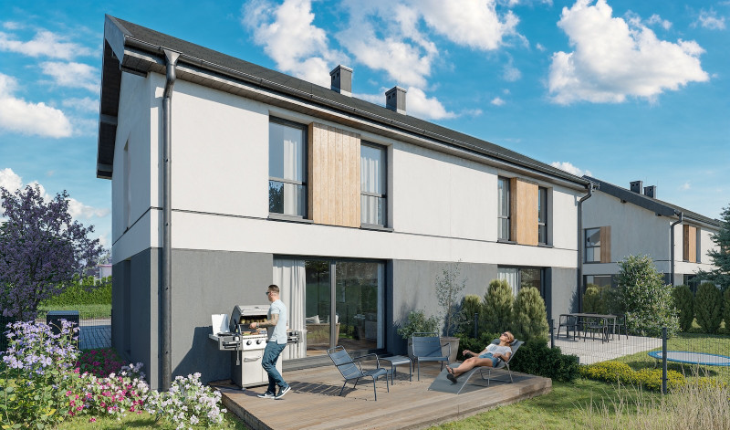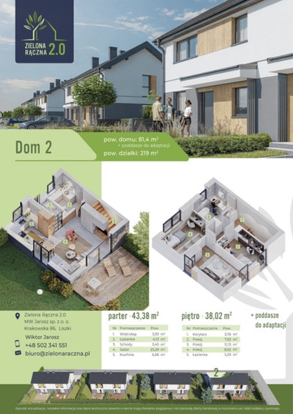 Osiedle "Zielona Rączna" ETAP II to kameralna inwestycja 8 domów jednorodzinnych w zabudowie bliźniaczej położona w malowniczej podkrakowskiej miejscowości Rączna, znajdującej się na obrzeżach Krakowa zaledwie 12 km od Rynku Głównego w Krakowie. Wszystkie domy wybudowane są w nowoczesnym stylu oraz przy użyciu najwyższej jakości materiałów. Dom posiada dwie kondygnacje w tym: