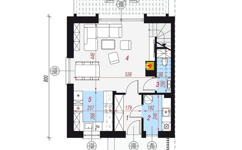 Parter: wiatrołap, hol, kuchnia z jadalnią, salon, łazienka, pralnia/kotłownia