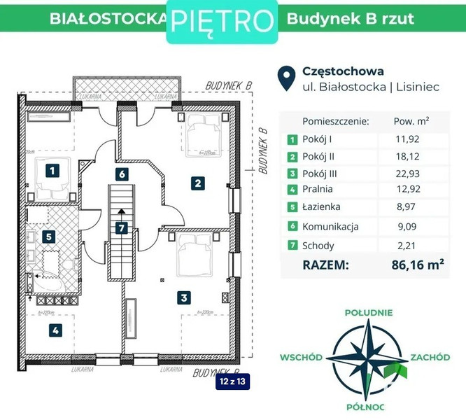 Pokój I (11.92 m²) • Pokój II (18.12 m²) • Pokój III (22.93 m²) • Pralnia (12.92 m²) • Łazienka (8.97 m²) • Komunikacja (11.3 m²)