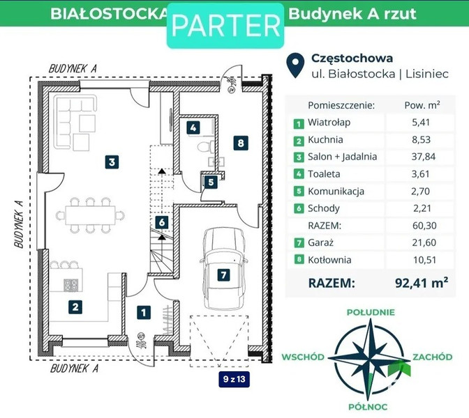 Wiatrołap (5.41 m²) • Kuchnia (8.53 m²) • Salon z jadalnią (37.84 m²) • Toaleta (3.61 m²) • Komunikacja (4.91 m²) • Garaż (21.6 m²) • Kotłownia (10.51 m²)
