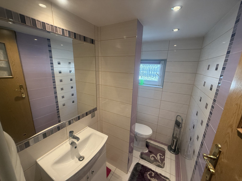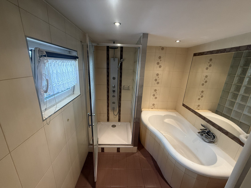 Trzy łazienki prysznic + wanna (ogrzewanie podłogowe), dwie na parterze z osobnym WC, trzecia na piętrze