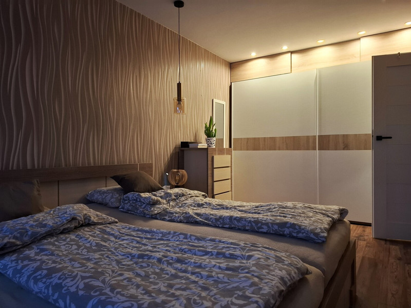 - główna sypialnia z dużą szafą i podwójnym łóżkiem,