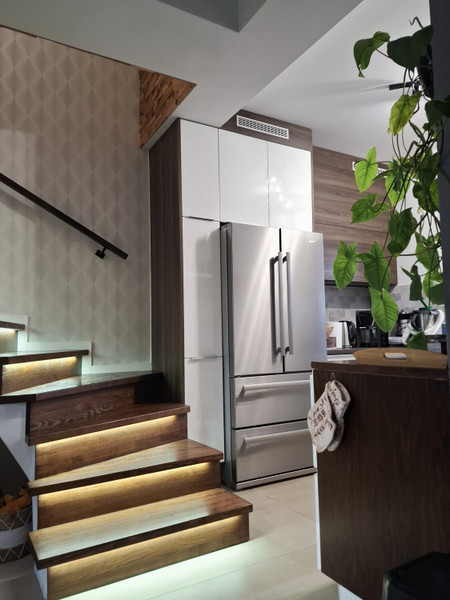 - kuchnia otwarta na salon, wyposażona w nowoczesne sprzęty AGD.