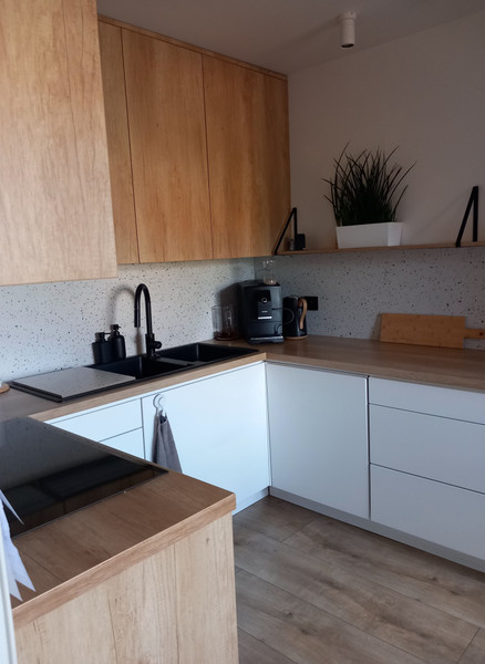 *kuchnia z zabudową na wymiar z wysokiej jakości sprzętem AGD ( płyta indukcyjna pięciopalnikowa, piekarnik, lodówka, zmywarka, okap )